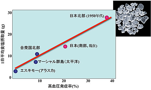 このグラフに示すように、1日の食塩摂取量と高血圧発症率には深い関係があります。