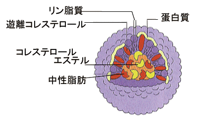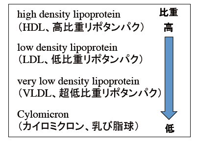 血液中の脂肪(コレステロール・中性脂肪など)は、このようなリポ蛋白の形になって流れてます。リポ蛋白は比重によって以下のように分類されます。 |