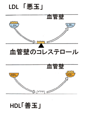 LDL(悪玉)コレステロールが関わっているのは「粥状硬化」とよばれる動脈硬化です。血液中にLDLが長い間とどまっていると、変性LDLになり、高血圧、喫煙などとともに血管の壁を傷つけてひび割れをつくり、そこから血液中のLDLが血管の内壁へと入りこみ、たまっていきます(だから悪玉)。一方、HDLは血管壁内にたまったコレステロールを取りさり肝臓へ戻す作用があります(なので善玉)。 |