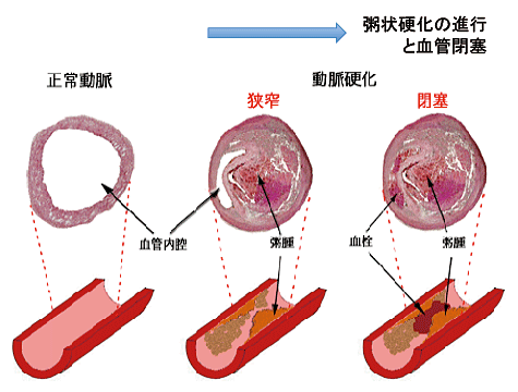 増えた脂肪が血管の内側にたまって、動脈硬化になります。動脈硬化になっても、まだ自覚症状がありませんが、血管が閉塞して心筋梗塞や脳梗塞の発作が起ってはじめて脂質異常症の重大さに気づきます。 |